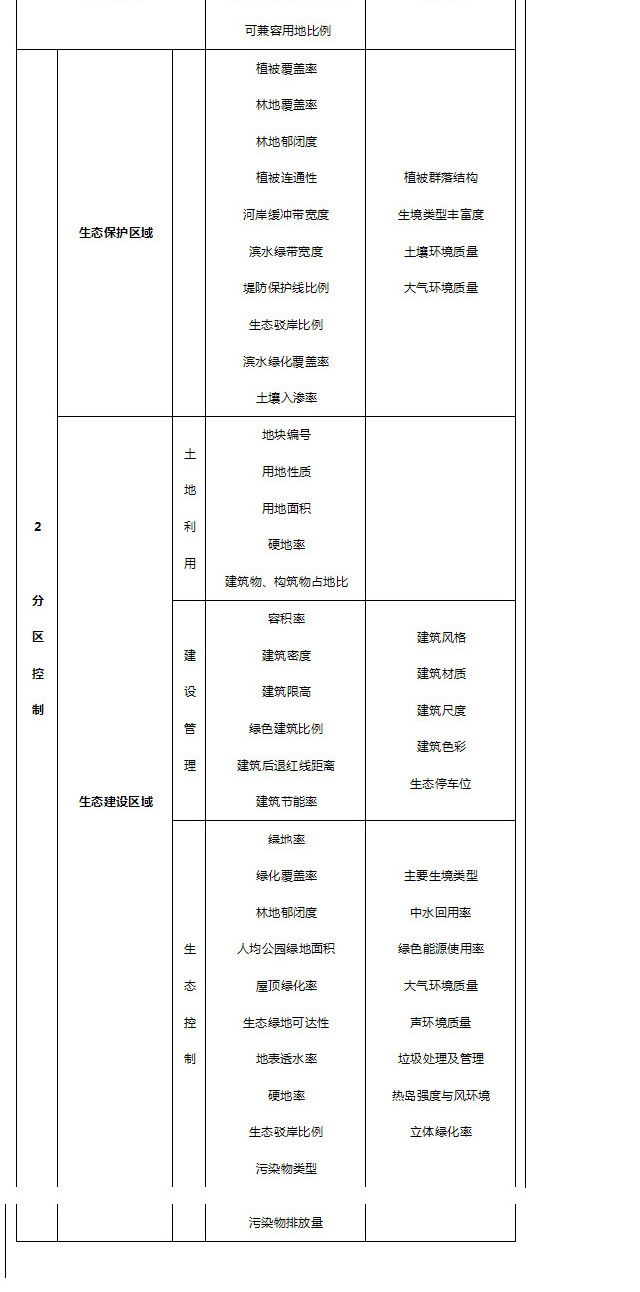 生態(tài)控制類的控制性指標(biāo)包括綠地率、綠化覆蓋率、林地郁閉度、人均公園綠地、屋頂綠化率、生態(tài)綠地可達(dá)性、地表透水率、硬地率、生態(tài)駁岸比例、污染物排放量等;引導(dǎo)性指標(biāo)包括主要生境類型、中水回用率、綠色能源使用率、大氣環(huán)境質(zhì)量、聲環(huán)境質(zhì)量、垃圾處理及管理、熱島強度與風(fēng)環(huán)境、立體綠化率等。